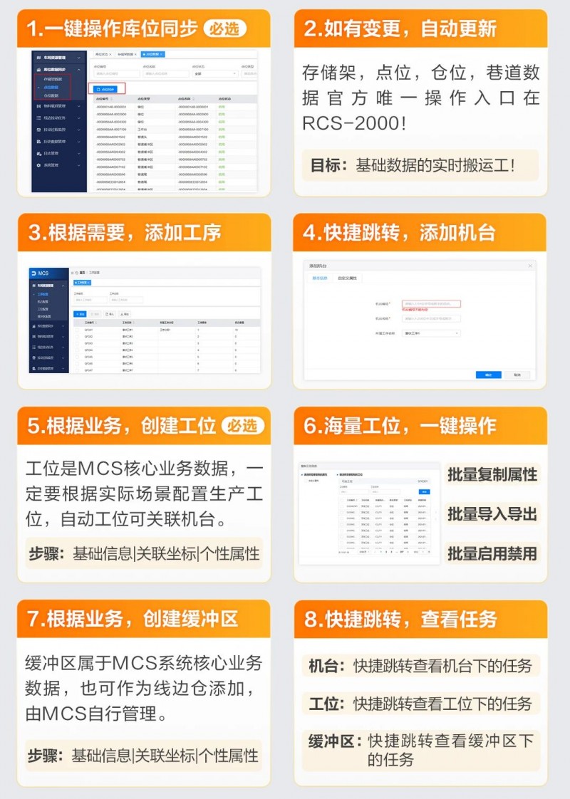 MCS可一鍵實現庫位同步,如有變更可以自動更新。用戶可根據需要,portant="" style="margin: 0px; padding: 0px; border: 0px; outline: 0px; vertical-align: baseline; background: transparent;">靈活添加工序、快捷跳轉并添加機臺。工位是MCS的核心業務數據,自動工位可關聯機臺,實現海量工位一鍵操作,包括批量復制屬性、導入導出、啟用禁用等功能。也支持根據業務需求創建緩沖區、快速跳轉并查看任務。最后實現物料、載具與庫位之間的靈活綁定。
